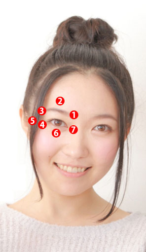 | 2.陽白(ようはく) 眉毛の上の縁から指1本分さらに上にあるくぼみ 目の疲れ、目の霞み、目の充血 |
